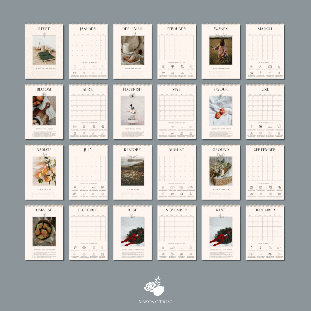 January: Reset | February: Replenish | March: Awaken | April: Bloom | May: Flourish | June: Savour | July: Linger | August: Restore | September: Ground | October: Harvest | November: Reflect | December: Rest